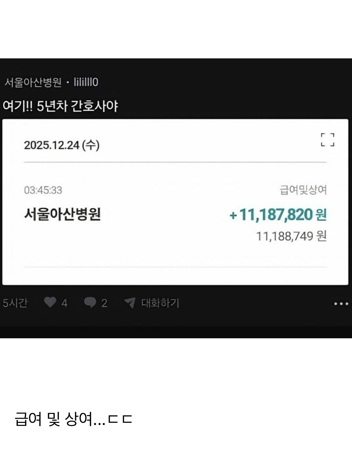 서울 아산병원 5년차 간호사 월급 인증 ㄷㄷ