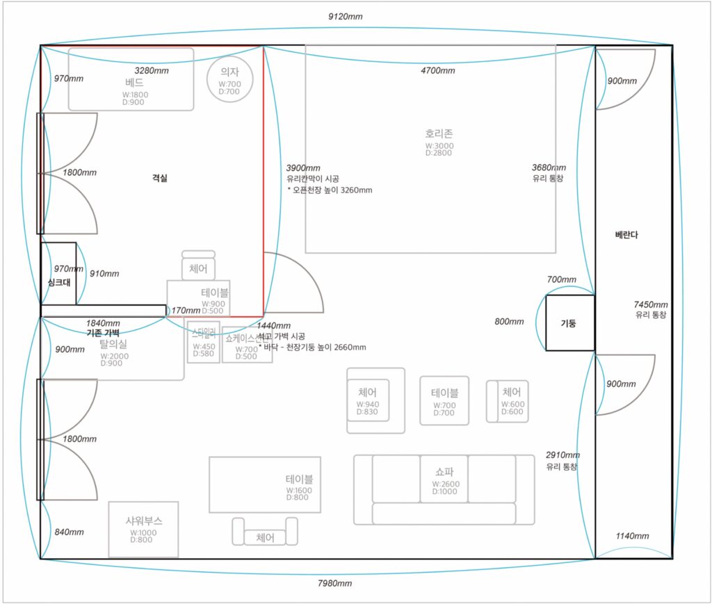 최초 시공시 MDF 목재 골조로 진행한 것이 아니라, 직접 사이즈 측량하여 포멕스 판넬로 인부들 고용하여 부착 및 페인트 칠한 형태로, 추후 원상복구에 굉장히 용이한 형태입니다!