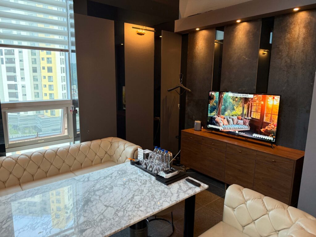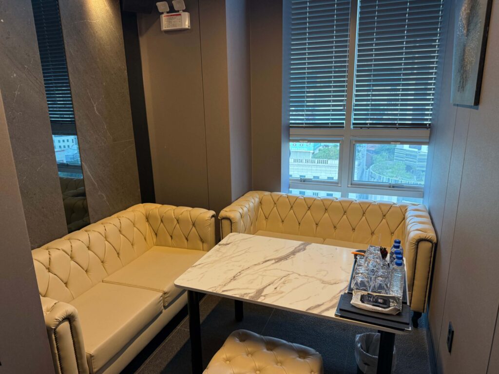 소파 6개, 큰 테이블 3 대, 화려한 조명까지 설치되어 있습니다.
